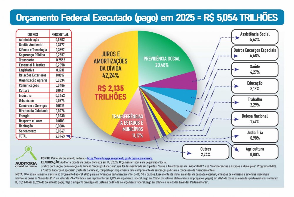 Conforme pagamentos constantes no orçamento federal em 2025, observando-se Gráfico em Pizza elaborado pela ACD (Auditoria Cidadã da Dívida), e o raio-x das emendas parlamentares, que significam gastos dos dinheiros da população, chamados também de "Dinheiros Públicos", feitos desplanejadamente e aleatoriamente, segundo os interesses privados de determinados grupos nos legislativos e nos executivos em todo o Brasil.